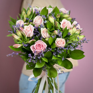 Букет Признание – это необычная композиция, сочетающая в себе пудровые альстромерии, нежно-розовые розы, лиловый лимониум и сочный эвкалипт. Такая свежая комбинация обязательно понравится всем, кто любит умеренные, не раздражающие глаз миксы.